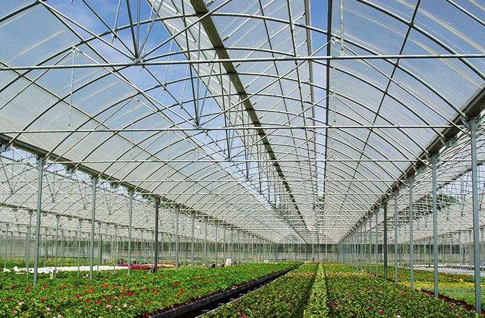 其在我處訂購的PC陽光板,采用德國原料譽耐8mm厚防霧滴陽光板,板材底面覆有一層抗冷凝處理的防霧滴層,具有自然的水擴散作用,使板材和冷凝水的表面張力大于空氣/水的表面張力,從而空氣中的水分在板材上均勻凝結(jié)成小水珠分布在板材上,沿著斜面(板材筋肋的方向)滑至邊緣,而并非直接滴落以達到防霧滴效果,防止溫室內(nèi)植物的損傷,同時改善溫室的透光率。